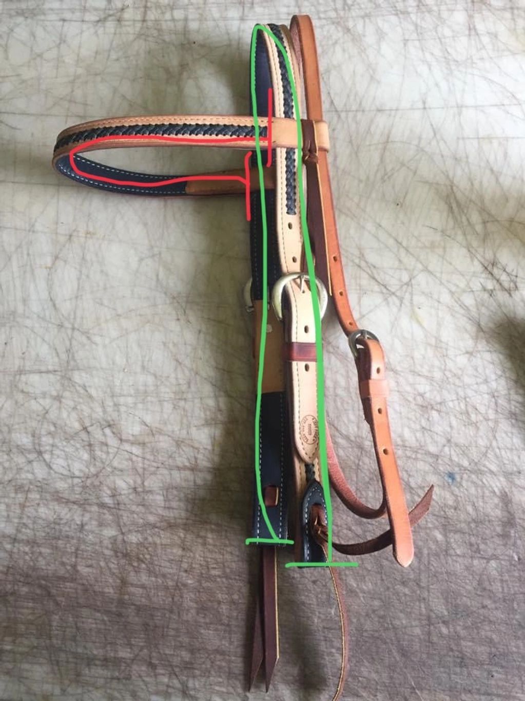 1- the overall length. The green line. measure from bit end to bit end. all new headstalls are measured with the buckles on the center hole. you want to measure from the most used holes.