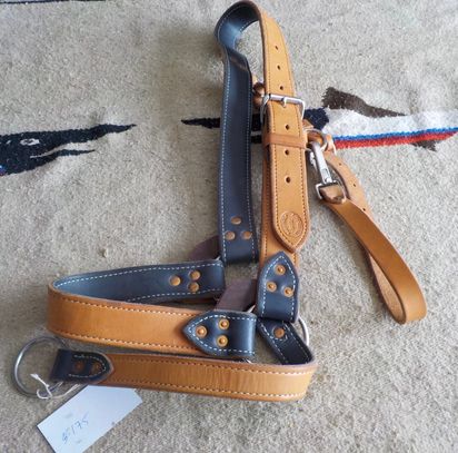 Large Rope draw halter. Made to fit large headed mules. Comes in black. two options, regular tie $50 or snap and ring, $55. Stainless steel hardware.